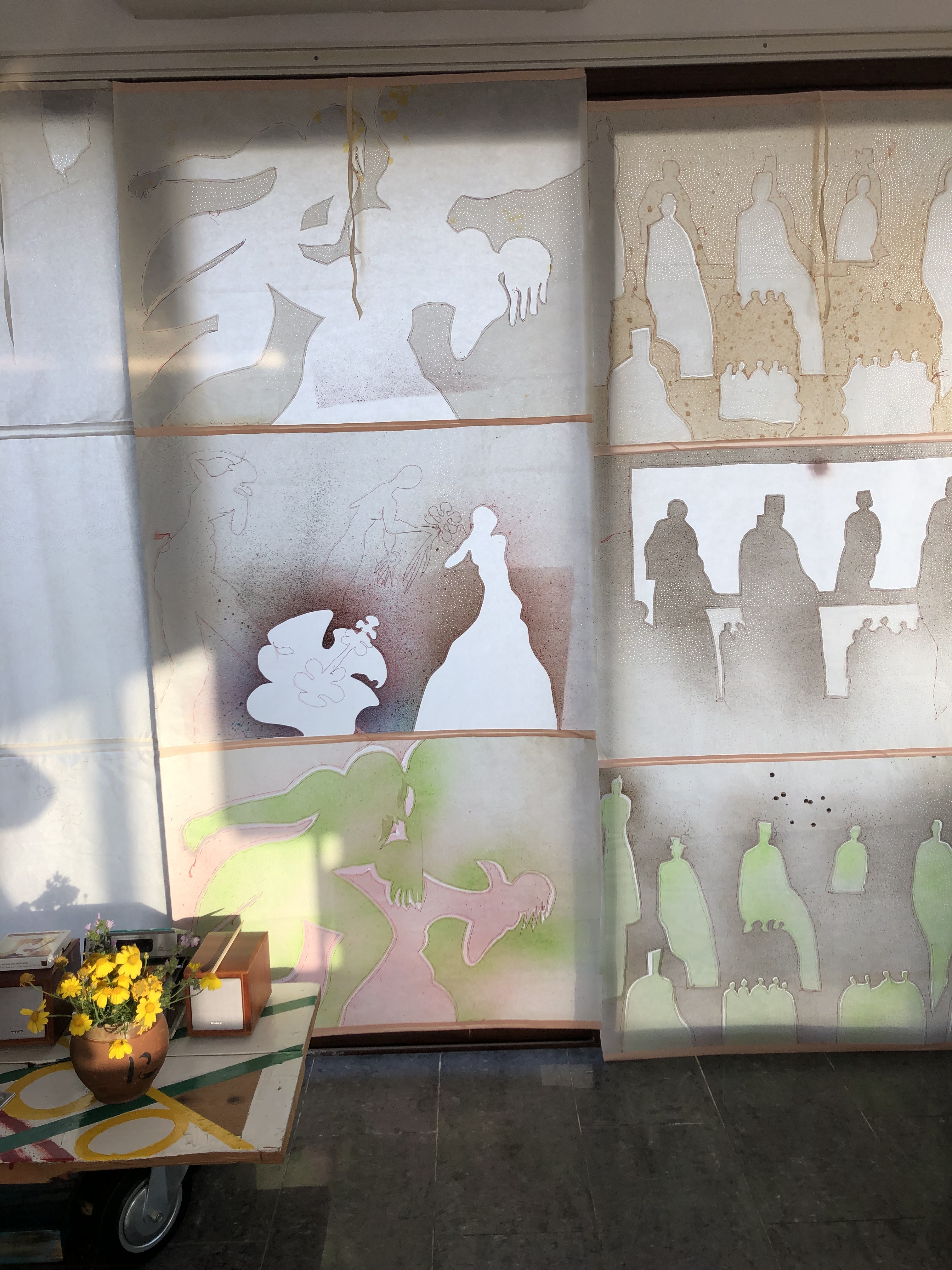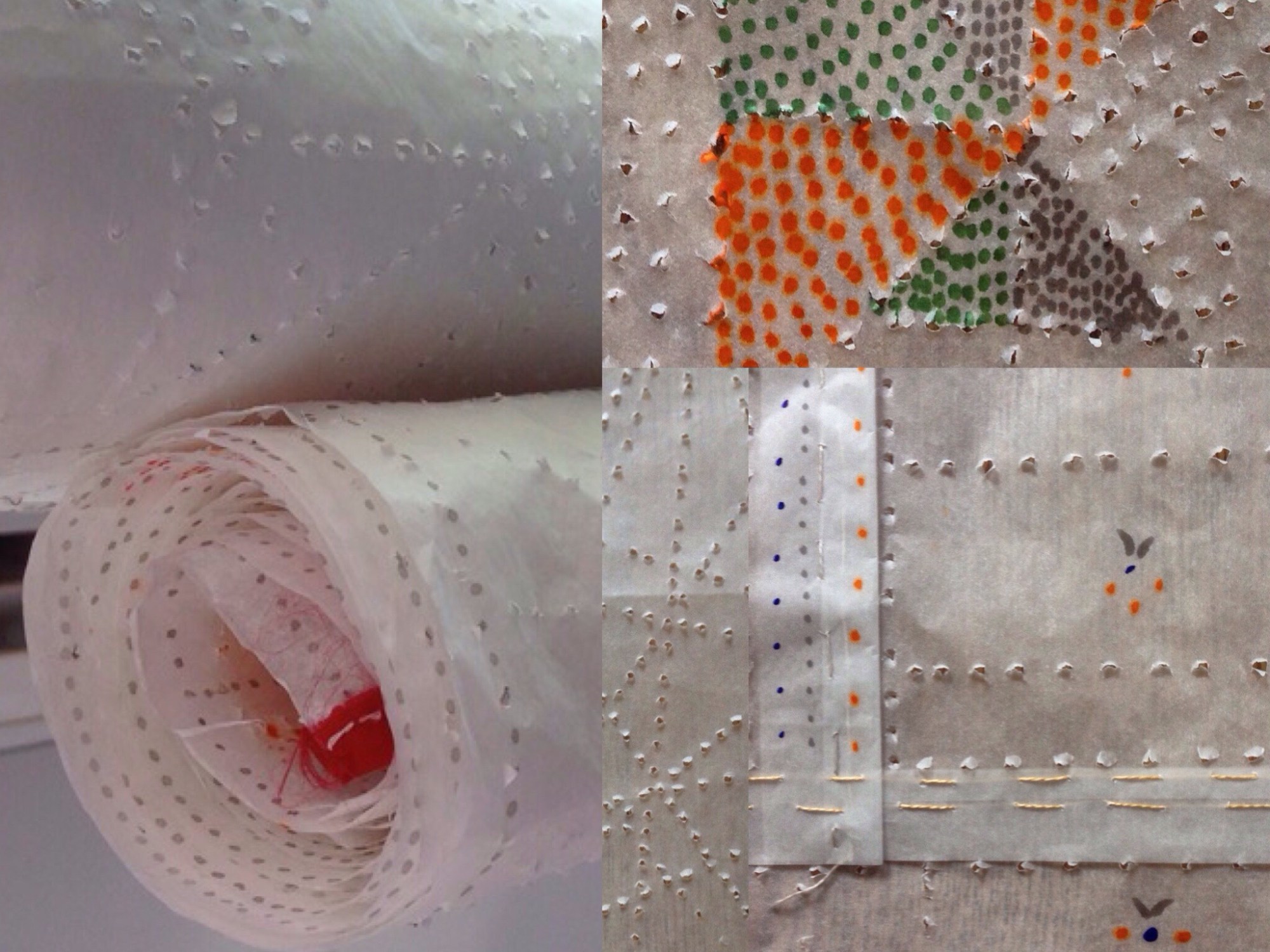 Paper curtains in Cyprus House. Daytime and nighttime impressions are different. I enjoy my recent work….it is functional paper art. 3 pieces each 220X 100 cm. Total 220×300 cm. it is rolled up to open and rolled down to close…Material: 2 layers of paper , cotton bias binding and silk thread, acrylic ink.